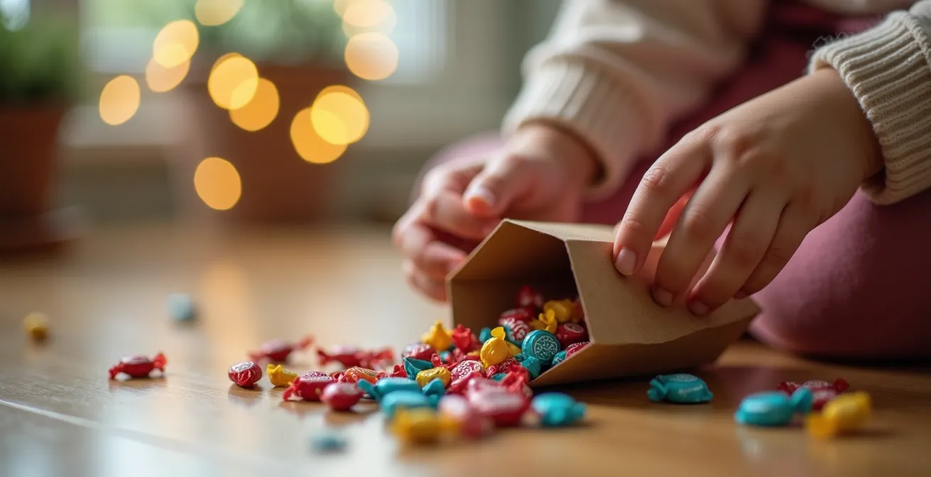 Les surprises consommables constituent la première catégorie. Bonbons artisanaux, chocolats, biscuits maison, tatouages éphémères ou même sachets de graines à planter offrent une gratification immédiate. Leur durée de vie limitée libère l’espace et évite l’accumulation, tout en créant un plaisir sensoriel direct. Budget type : 0,30€ à 1€ par unité.